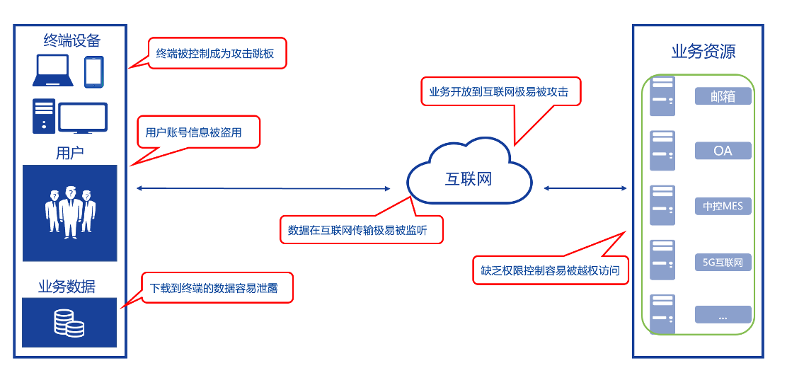 惠州xx化工有限责任公司是一家专注于化学原料和化学制品制造的领先企业。为了满足业务需求,公司多个业务系统(如邮箱、OA、MES系统等)需通过互联网供业务部门使用PC或手持智能终端(平板等)直接访问。然而,传统的防火墙DNAT目的地址端口映射方式容易遭受外部黑客攻击,而传统SSL-VPN在权限管控方面存在不足,可能导致非法访问和非授权资源泄露。因此,公司亟需一套更安全的互联网外部访问内网系统的解决方案。