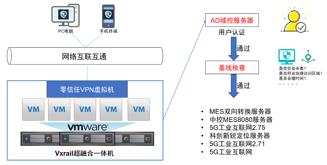 通过xx化工有限责任公司现有vxrail超融合一体机上部署零信任VPN虚拟机,对接现有AD域控服务器做用户认证,终端完成认证后会自动进行基线检查,如是否安装公司指定杀毒软件、系统版本与补丁是否满足公司安全要求、是否在符合的地理区域进行登录、是否在合理时间进行登录等一系列基线检查通过后,才放通该用户访问被指定允许的业务系统。