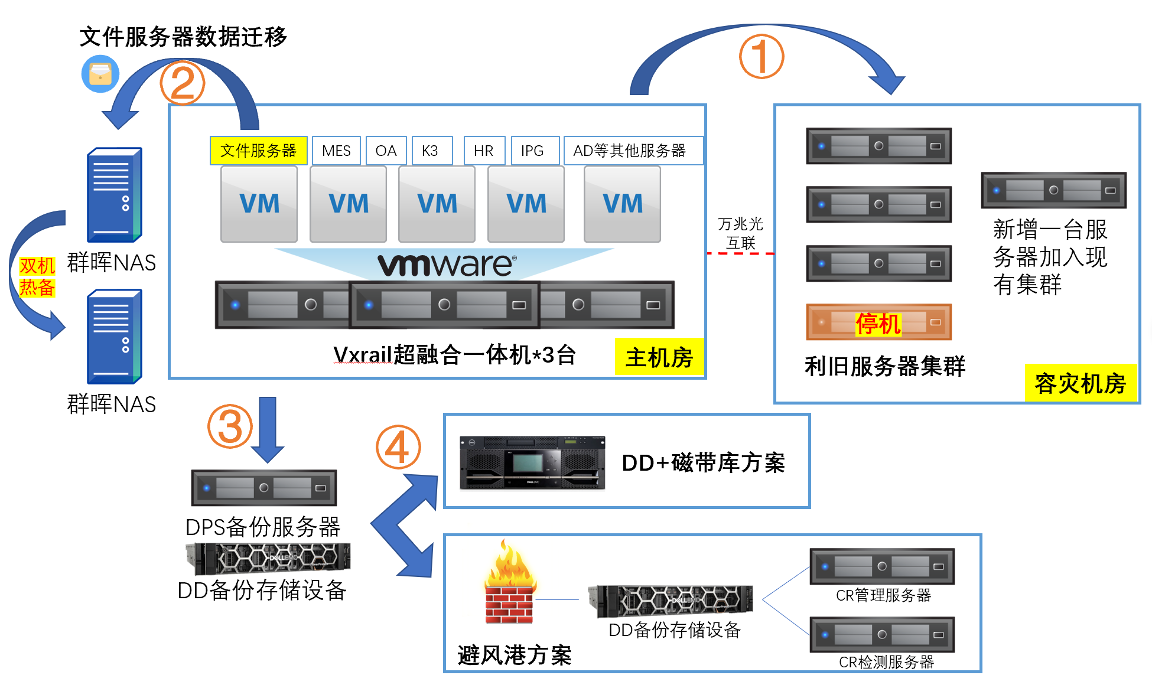 a) 措施:利旧现有服务器扩容VMware集群,通过VMware RP4VM工具实时同步核心MES业务系统数据。